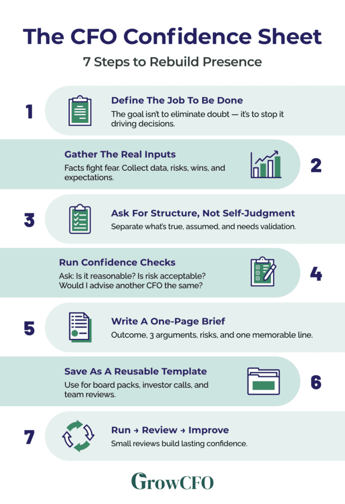 Before your next senior meeting, spend five minutes completing Steps 1–3. You’ll walk in clearer, calmer, and more credible — not because the doubt is gone, but because it’s contained.